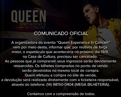 A produtora do espetáculo “Queen Experience In Concert”, que aconteceria nesta quinta-feira, 19, às 21h, na Casa de Cultura de Bragança Paulista, informou que, por motivos de força maior, o show teve de ser cancelado. Confira o comunicado na íntegra: