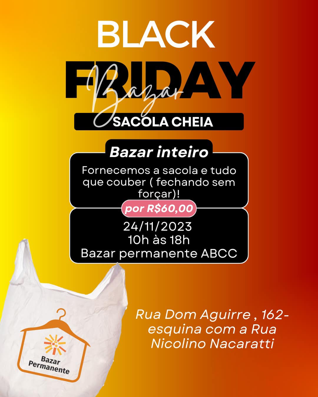O Bazar Permanente da ABCC (Associação Bragantina de Combate ao Câncer) acontecerá nesta sexta-feira, 24, das 10h às 18h, com a imperdível promoção da Black Friday intitulada “Sacola Cheia”. A entidade fornecerá a sacola e você poderá colocar tudo o que couber dentro dela e levar para casa por apenas R$ 60,00. Em contato com […]