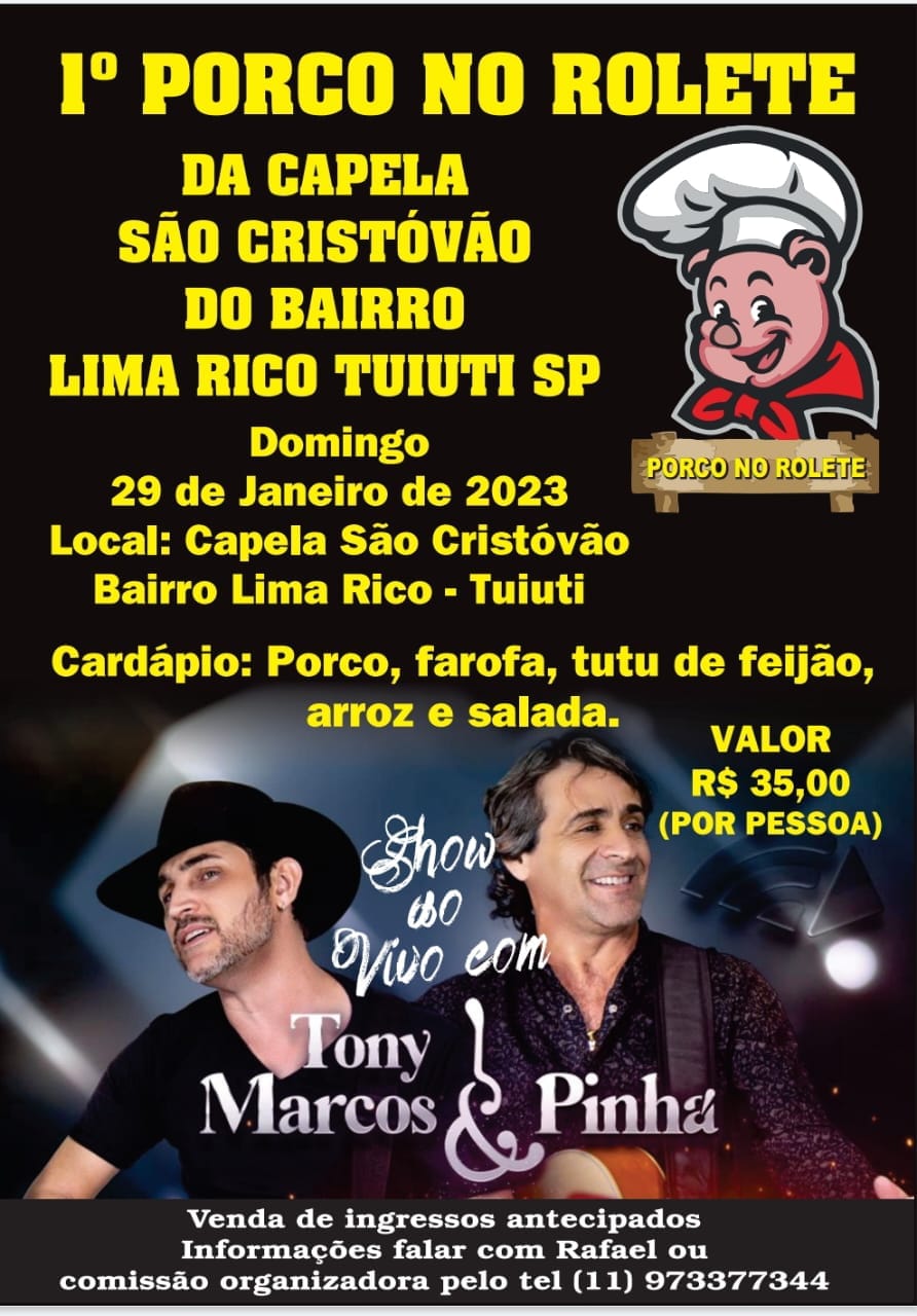 A Capela de São Cristóvão, no Bairro do Lima Rico, na vizinha cidade de Tuiuti, realiza, a partir das 12h do dia 29 (domingo), um delicioso “porco no rolete”, que será servido com arroz, tutu de feijão, farofa e salada. Os convites já podem ser adquiridos pelo valor de R$ 35,00 por pessoa, ressaltando que […]