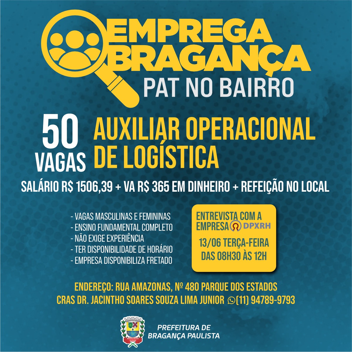 O Posto de Atendimento ao Trabalhador (PAT) promove nesta terça-feira, 13, o evento “PAT no Bairro” no CRAS Dr. Jacintho Soares Souza Lima Júnior, no Parque dos Estados. O objetivo da ação é oferecer 50 vagas de emprego na área de logística para os moradores da região. A empresa contratante DPXRH será a responsável […]