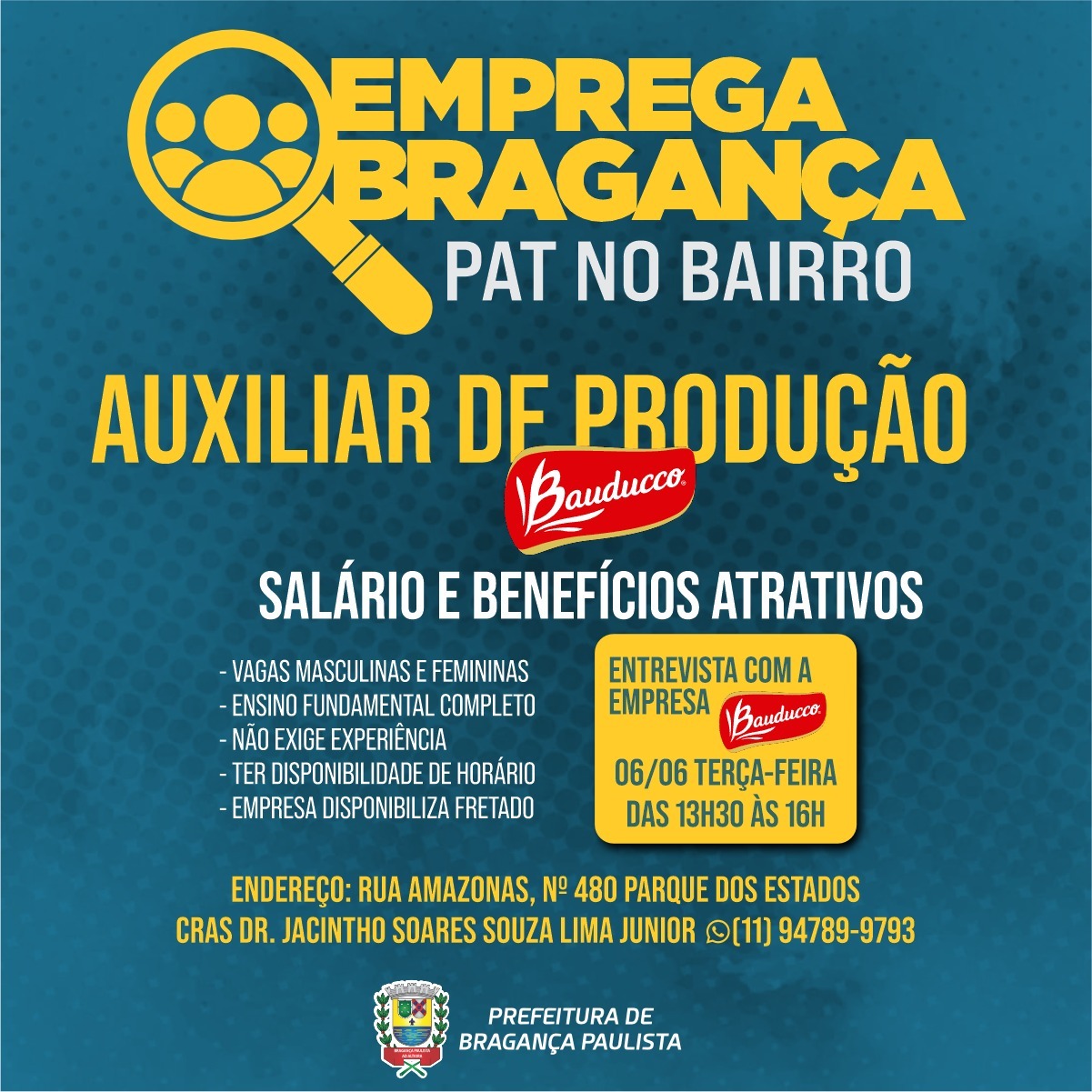 Nesta terça-feira, 6 de junho, o Posto de Atendimento ao Trabalhador (PAT) promoverá o evento PAT no Bairro, no CRAS Dr. Jacintho Soares Souza Lima Júnior, localizado no Parque dos Estados, em Bragança. A edição contará com vagas de emprego para auxiliar de produção na empresa Bauducco. As entrevistas de seleção serão conduzidas pela própria […]
