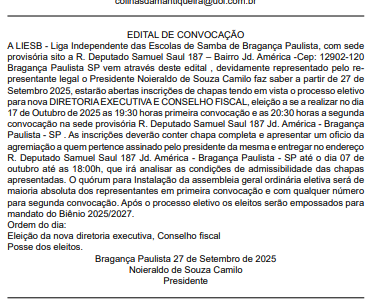 A Liga Independente das Escolas de Samba de Bragança Paulista (LIESB), representada por seu presidente Noieraldo de Souza Camilo (Noi Camilo), publicou neste sábado, 27, o edital de convocação para o processo eletivo da nova Diretoria Executiva e Conselho Fiscal da entidade. As inscrições de chapas estarão abertas a partir deste sábado, 27 de setembro. […]
