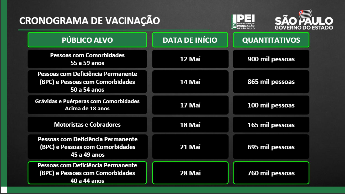 Em coletiva de imprensa ocorrida nesta quarta, 19, o governador João Doria anunciou que, a partir do dia 28 de maio, pessoas entre 40 e 44 anos, que tenham algum tipo de comorbidade ou deficiência começarão a ser vacinadas contra a Covid-19, em São Paulo. O público estimado deste grupo é de 760 mil pessoas. […]