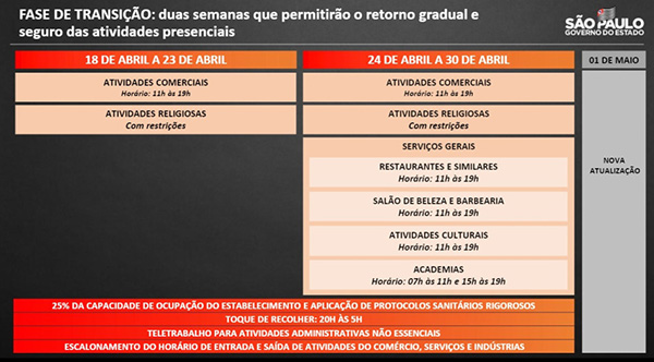 O governo estadual anunciou, ontem, 16, uma nova fase do Plano São Paulo de flexibilização da quarentena, entre a vermelha e a laranja, que autoriza a abertura de comércios e atividades religiosas em horários reduzidos de funcionamento a partir deste domingo, 18. Com isso, shoppings e lojas de rua, que só poderiam operar a partir da fase laranja, […]