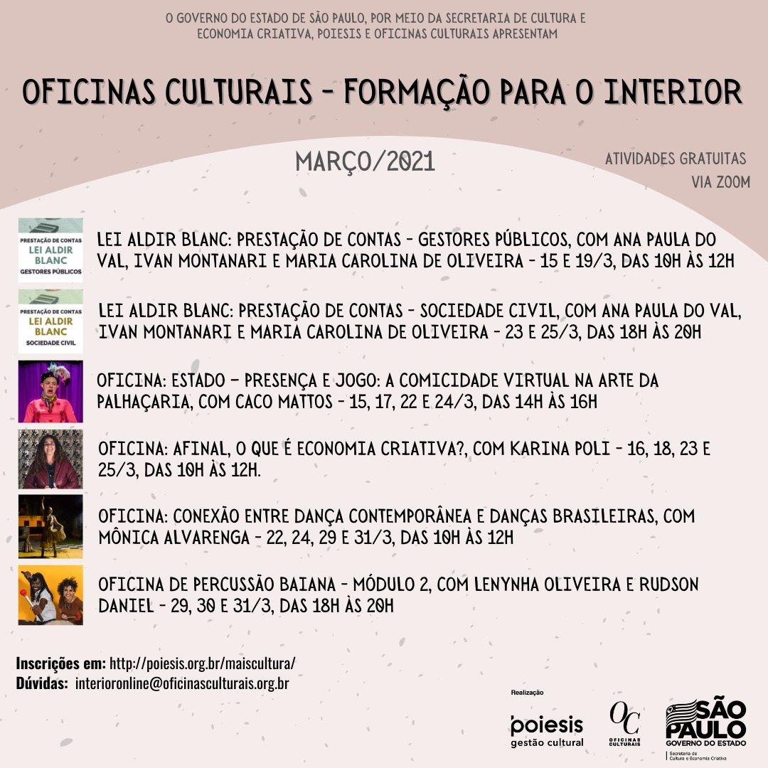 Estão abertas as inscrições para as atividades do mês de março do programa “Oficinas culturais – Formação para o interior”. A ação tem parceria do governo de São Paulo, por meio da Secretaria de Cultura e Economia Criativa, Poiesis e Oficinas Culturais, com a Prefeitura Municipal. O destaque da programação são as oficinas relacionadas ao […]