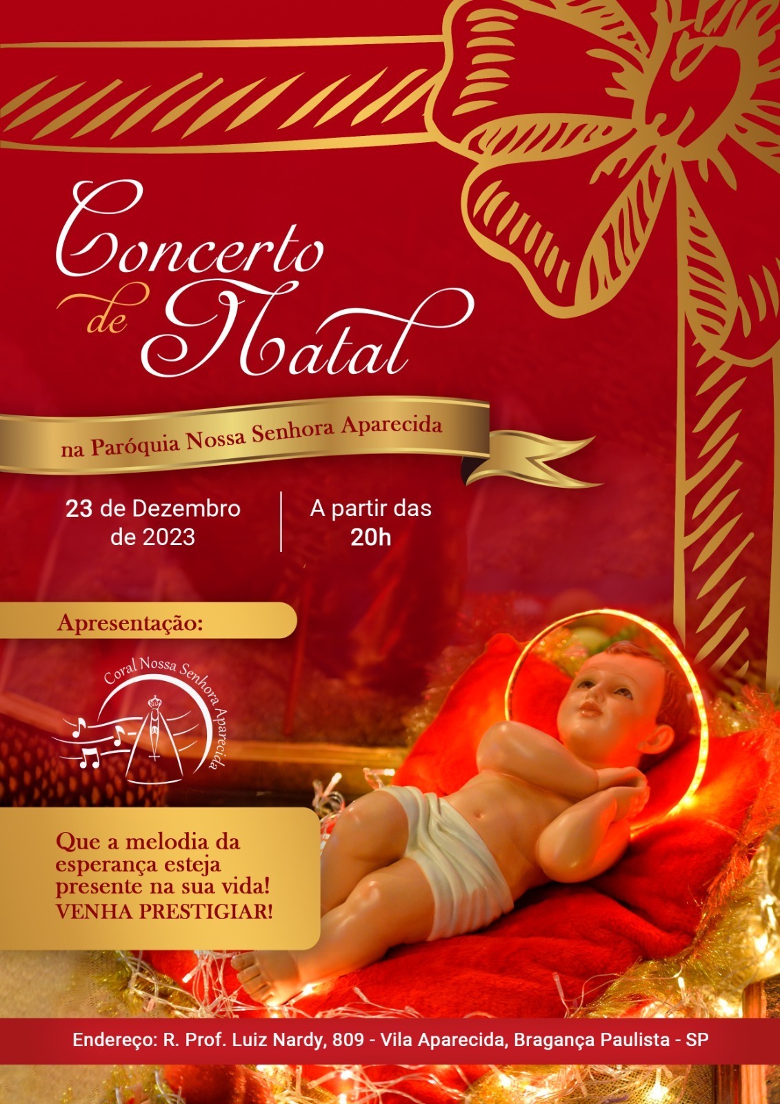 A Paróquia de Nossa Senhora Aparecida realizará, no sábado, dia 23 de dezembro, uma programação especial em preparação para o Natal. Destaque para o Concerto de Natal, que contará com a apresentação do Coral da Igreja. O evento natalino será realizado logo após a missa das 19h, na Igreja de Nossa Senhora Aparecida, localizada na […]
