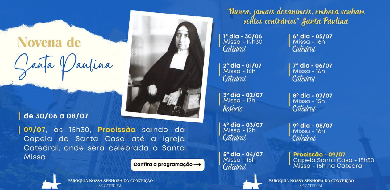 Bragança Paulista celebra, no dia 9 de julho, o Dia de Santa Paulina, reconhecida como a primeira santa brasileira e com parte de sua vida dedicada à comunidade bragantina. Em honra à santa, teve início na última sexta-feira, 30, na Igreja Sé Catedral, a novena, que seguirá até o dia 8 de julho. Durante esta […]
