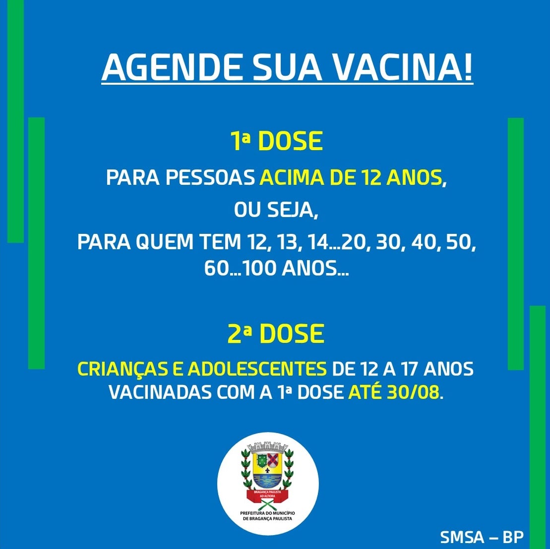 A Prefeitura de Bragança Paulista, por meio da Secretaria Municipal de Saúde, abrirá agendamento de 1ª, 2ª e 3ª dose, nesta terça-feira, 26, a partir das 12h, para vacinação contra a Covid-19, sendo: 1ª dose – Para pessoas acima de 12 anos; 2ª dose – Pfizer – Para PESSOAS ACIMA DE 18 ANOS vacinados até […]