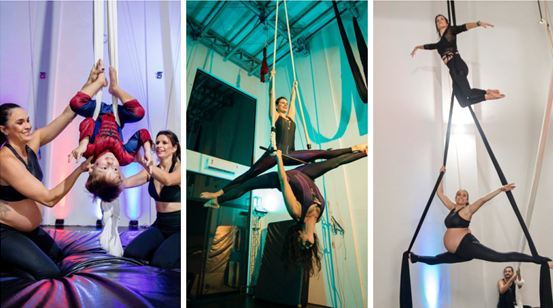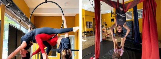 A instalação de aparelhos de ar-condicionado e películas nas janelas não foi um luxo, mas uma necessidade de saúde e performance para as aulas de tecido acrobático, lira e acroyoga. “Se não tivéssemos feito esse investimento, a sala estaria muito quente, afetando a saúde dos alunos”, explica Marcela.