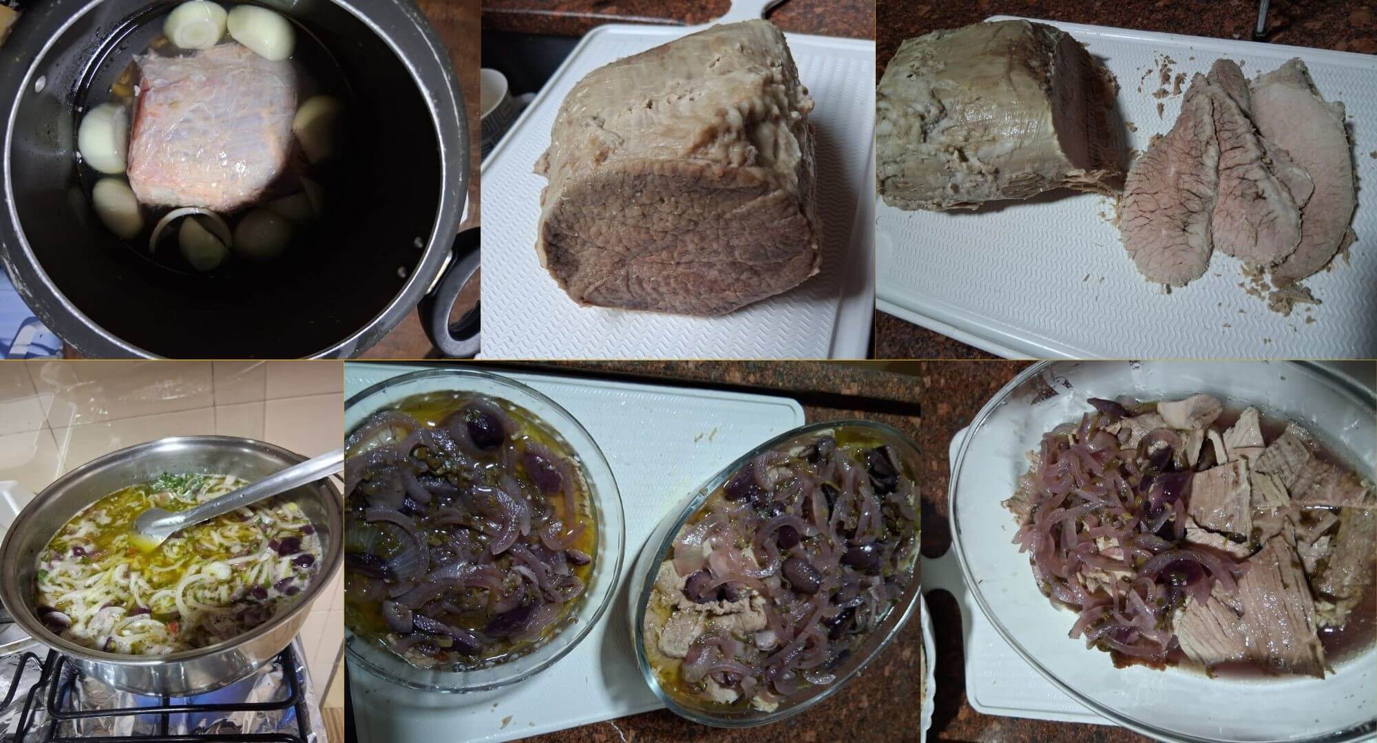 – Num pirex com tamanho suficiente para o preparo, coloque uma camada desse molho, as fatias de lagarto e as azeitonas. Repita o molho de cebolas, as fatias de carne e azeitonas até terminar os ingredientes. Cubra com papel filme e leve gelar.