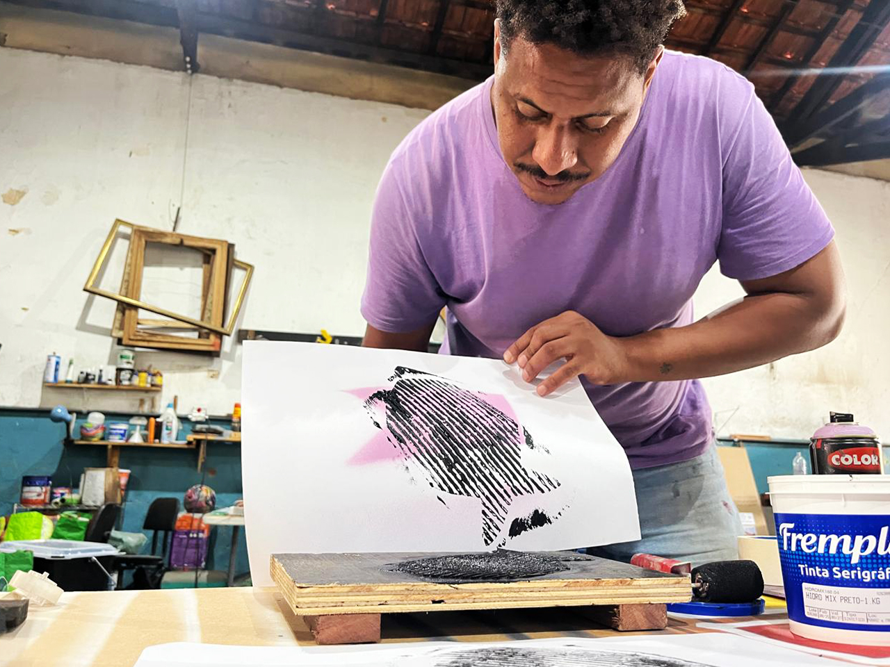 Oficina que convida o público a refletir sobre a essência cultural do interior paulista por meio da arte impressa. Os participantes utilizam técnicas de xilogravura, grafite e carimbo para criar cartazes inspirados em elementos da fauna, flora e identidade de seu próprio território.
