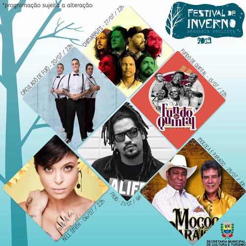O tradicional Festival de Inverno de Bragança Paulista vem aí! E, em sua 18ª edição, oferecerá diversas atrações culturais gratuitas à população. O evento é realizado desde 2001 pela Prefeitura Municipal, por meio da Secretaria de Cultura e Turismo, e neste ano, acontece entre os dias 5 e 31 de julho. Durante esse período, haverá diversos atrativos na cidade, como shows musicais, apresentações de teatro infantil e infanto-juvenil, circo, festas julinas, stand up comedy, oficinas de arte e gastronomia, palestras, entre outros.