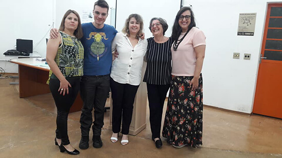 A escritora ao lado do então mestrando Júnior, da orientadora do trabalho e das professoras doutoras que compuseram a banca
