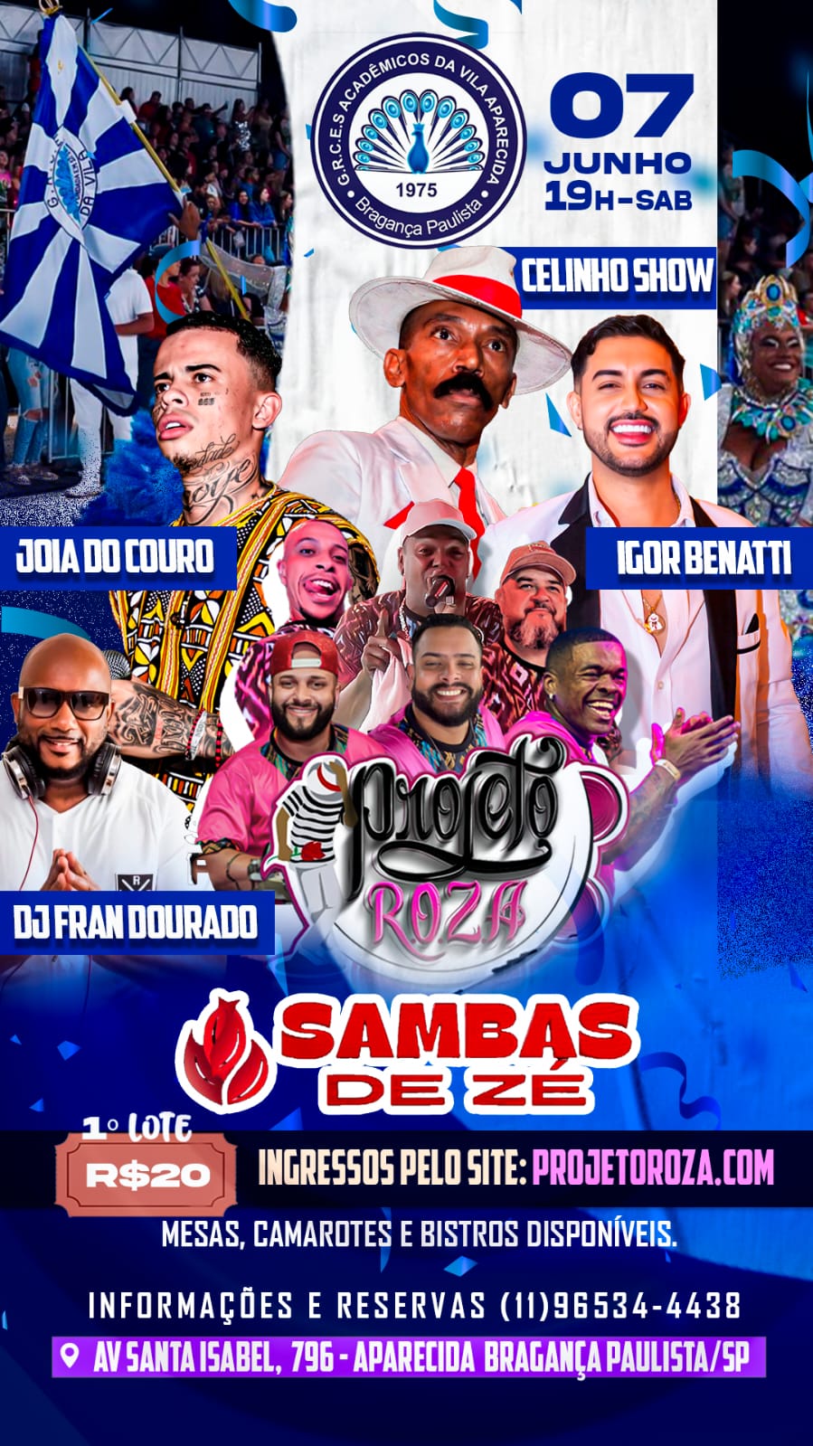 - 7 de junho – Sambas de Zé (sábado, a partir das 19h): uma grande roda de samba com as participações de Celinho Show, Igor Benatti, DJ Fran Dourado, Joia do Couro e o grupo Projeto Roza. Os ingressos estão disponíveis pelo site www.projetoroza.com a partir de R$ 20 (1º lote). Há opções de mesas, camarotes e bistrôs. Mais informações e reservas pelo telefone: (11) 96534-4438.