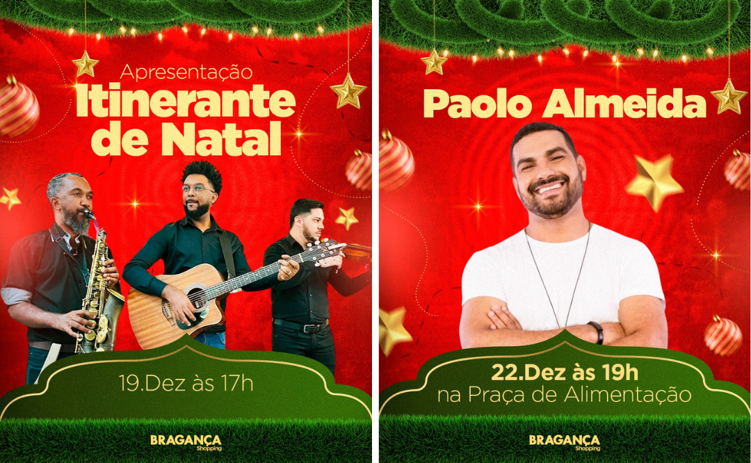 Faltam menos de dez dias para o Natal e o Bragança Shopping Center preparou uma programação especial para a próxima semana. Na terça-feira, 19, a partir das 17h, um trio de músicos com repertório de Natal animará o ambiente por todo o shopping. Na sexta-feira, 22, a partir das 19h, haverá um show com o cantor Paolo Almeida com repertório especial de Natal na praça de alimentação. Se você estiver fazendo suas compras de Natal no shopping, aproveite para apreciar uma boa música!