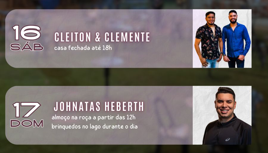 Este final de semana, no Bar e Restaurante Rural Rincão Bragantino, terá muita música sertaneja com a dupla Cleiton & Clemente hoje, às 18h, e o cantor Johnatas Heberth amanhã, no “Almoço na Roça”, a partir das 12h. Brinquedo no lago disponível no domingo. O Rincão Bragantino está localizado na Estrada Antônio Moreno, no Bairro do Campo Novo. Para informações e reservas de mesa, ligue para: (11) 9 4486-4473 e fale com Aldo.