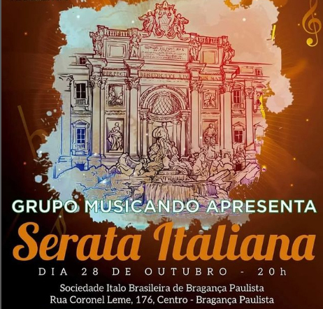 Hoje, às 20h, o Grupo Musicando apresentará, com entrada gratuita, a tradicional “Serata Italiana” na sede da Sociedade Ítalo-Brasileira de Bragança Paulista, localizada na Rua Coronel Leme, 176, no Centro.