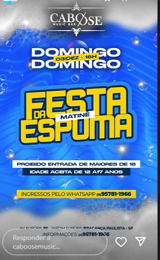Neste domingo, a partir das 16h, o Caboose Bar Music abre suas portas para a garotada de 12 a 17 anos, que vai curtir um super evento animado - a Matinê “Festa da Espuma”. Os ingressos podem ser adquiridos pelo WhatsApp: (11) 9 5781-1966. Adolescentes maiores de 18 anos estão proibidos de entrar no recinto. Essa festa é exclusiva para garotos e garotas com idade até 17 anos. O Caboose Bar Music está localizado na Av. Europa, 92, no Jardim Europa. Mais informações: (11) 9 5781-1966 (WhatsApp).