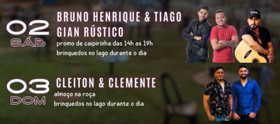 Mais um final de semana chegou! E se você não sabe onde se divertir com a família, o Bar e Restaurante Rural Rincão Bragantino é uma ótima opção. Lá você encontra diversão, boa música sertaneja e deliciosos pratos com comidas típicas, além do brinquedo no lago, que estará à disposição dos visitantes no sábado e no domingo o dia todo. Na parte musical, hoje haverá duas atrações: as duplas Bruno Henrique & Tiago e Gian Rústico. Das 14h às 19h, vai rolar a promoção de caipirinha. Já amanhã, a partir das 12h, acontece o tradicional “Almoço na Roça” ao som da dupla Cleiton & Clemente. O Rincão Bragantino está localizado na Estrada Antônio Moreno, no Bairro do Campo Novo. Para mais informações e reservas de mesa, ligue: (11) 9 4486-4473, falar com Aldo.