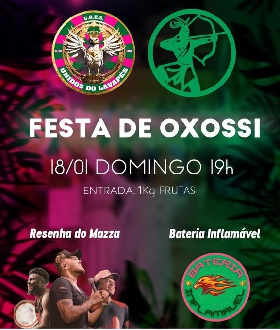 Neste domingo, 18, a partir das 19h, a Unidos do Lavapés realiza uma festa em homenagem a Oxóssi, protetor da escola. O evento acontecerá na quadra de ensaios da Verde e Rosa, o Ninho da Águia, localizada na Avenida Eusébio Savaio, 240, no Bairro Santa Libânia.