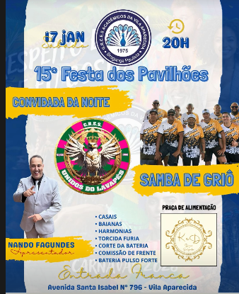 A Acadêmicos da Vila promove, neste sábado, 17, a partir das 20h, a 15ª Festa dos Pavilhões, um dos eventos mais tradicionais do pré-carnaval de Bragança Paulista. A celebração acontece na Morada do Samba, quadra da escola, com entrada gratuita. A festa homenageia as bandeiras das escolas de samba convidadas, simbolizando união e respeito entre as coirmãs.
