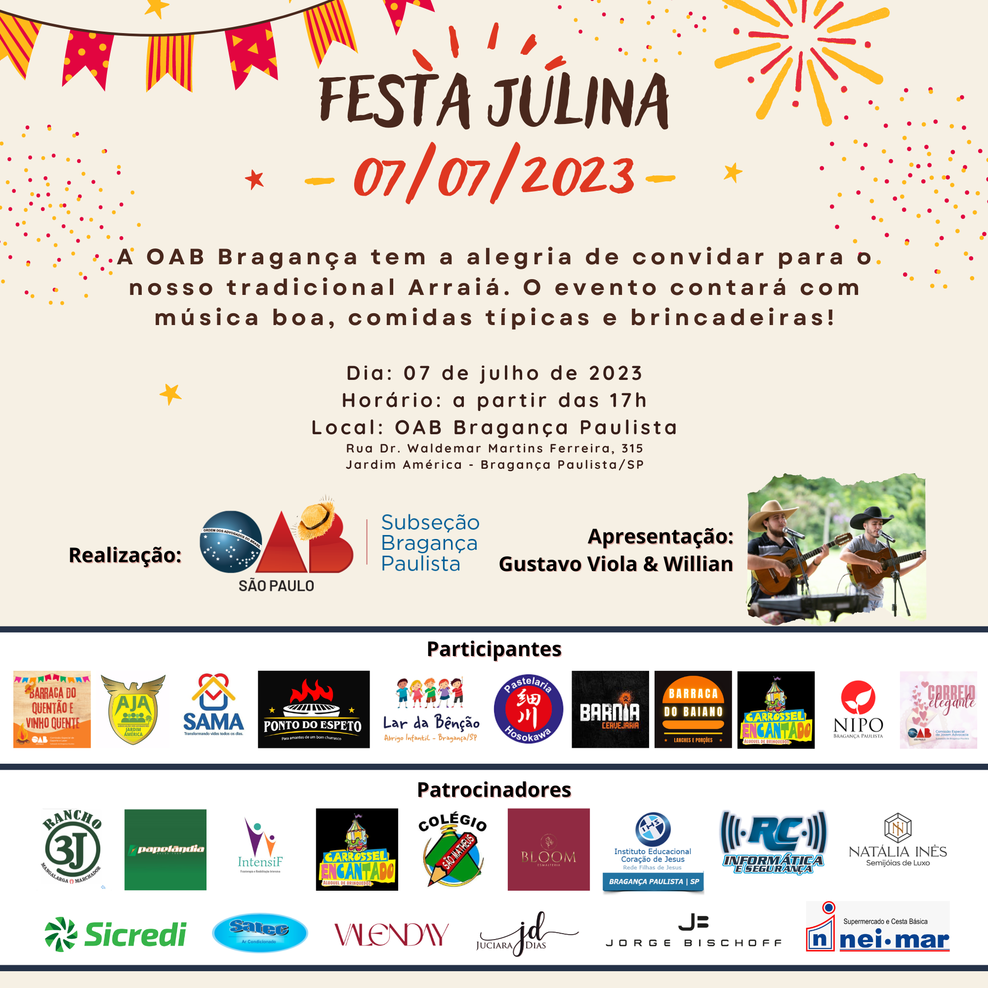 A Diretoria da 16ª Subseção da OAB Bragança prepara um animado "Arraiá da OAB Bragança Paulista" nesta sexta-feira, 7 de julho, a partir das 17h, no Estacionamento da OAB, localizado na Rua Dr. Waldemar Martins Ferreira, 315, Jardim América. A entrada para o evento é gratuita, e haverá venda de fichas no local para aproveitar as barracas de comidas e bebidas típicas, brincadeiras e música ao vivo com o show da dupla Gustavo Viola & Willian. Vale ressaltar que o pagamento será no cartão de débito e dinheiro. (Não será aceito cartão de crédito).