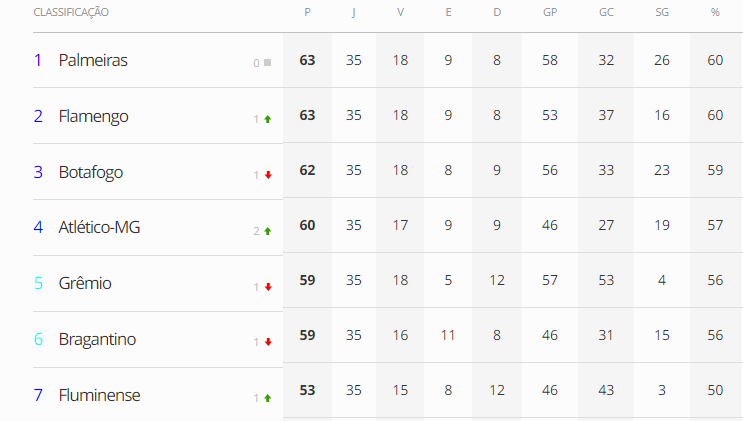 O Atlético-MG, que venceu o Grêmio na rodada, ultrapassou o Bragantino e assumiu a quarta posição. Com apenas três rodadas restantes para o final do campeonato, o time comandado pelo técnico Pedro Caixinha praticamente saiu da briga pelo título, já que a diferença para o primeiro colocado aumentou para quatro pontos.