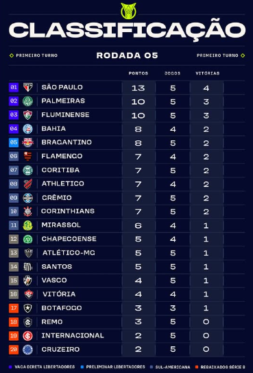 Até o momento, a campanha do Braga no Brasileirão registra duas vitórias, dois empates e apenas uma derrota, mantendo a equipe entre os cinco primeiros colocados da tabela após cinco rodadas disputadas.