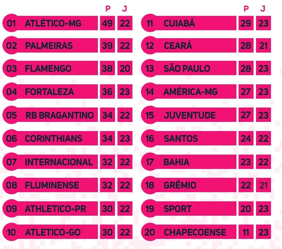 Confira a classificação atualizada do Brasileirão, após a 23ª rodada.