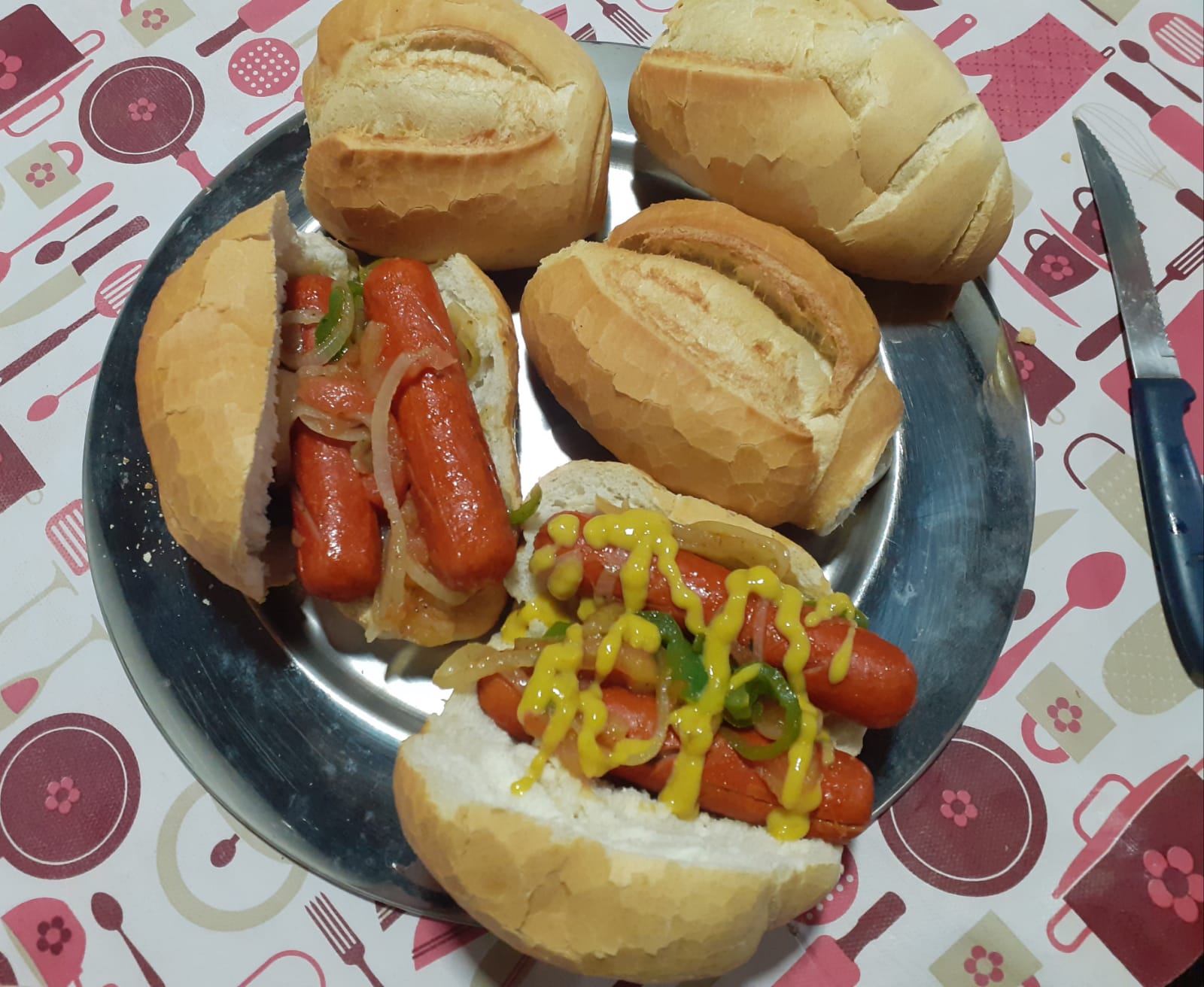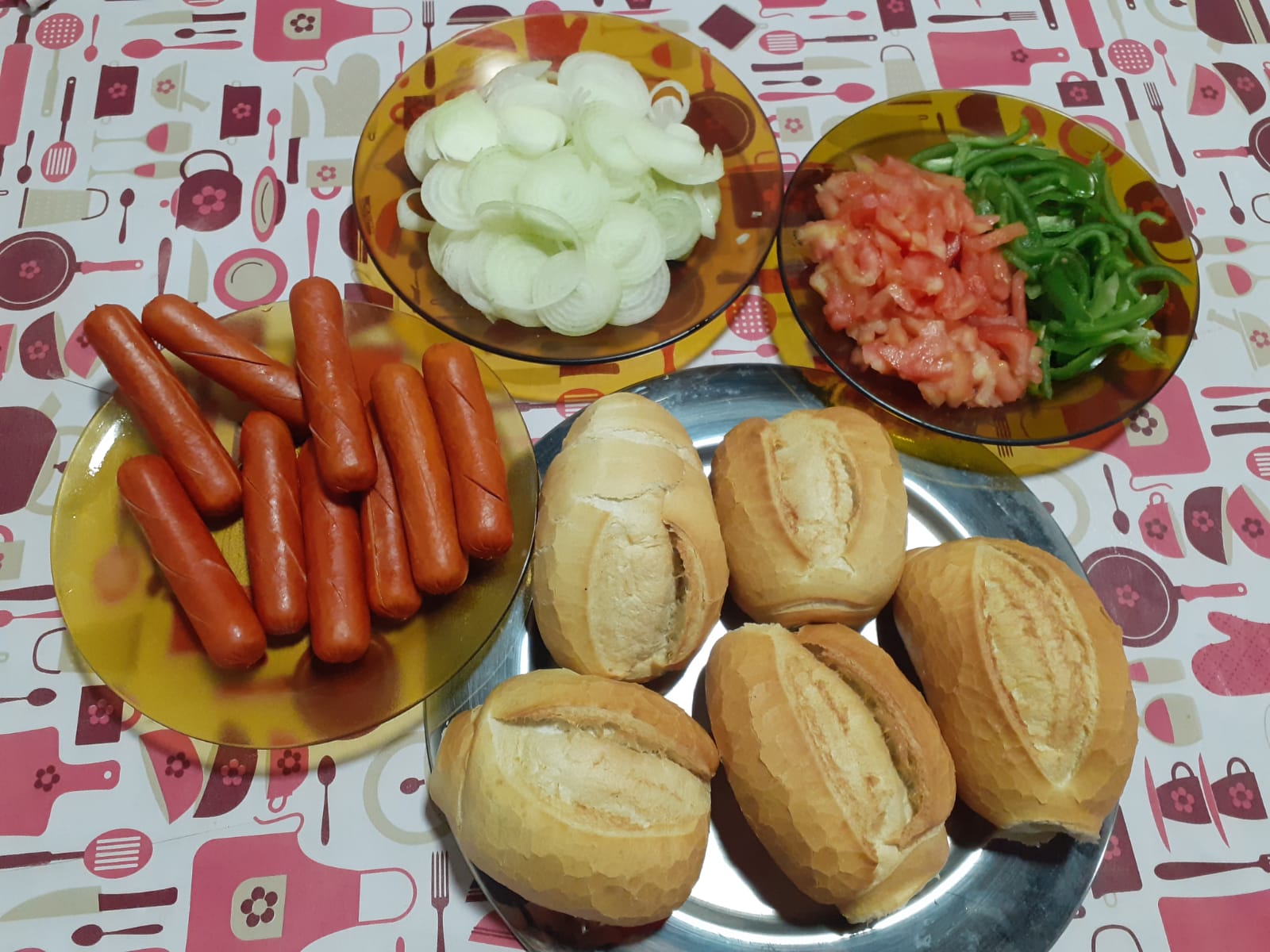 - Para 5 pães, usei: 10 salsichas, 4 cebolas, 1 pimentão pequeno e 2 tomates.