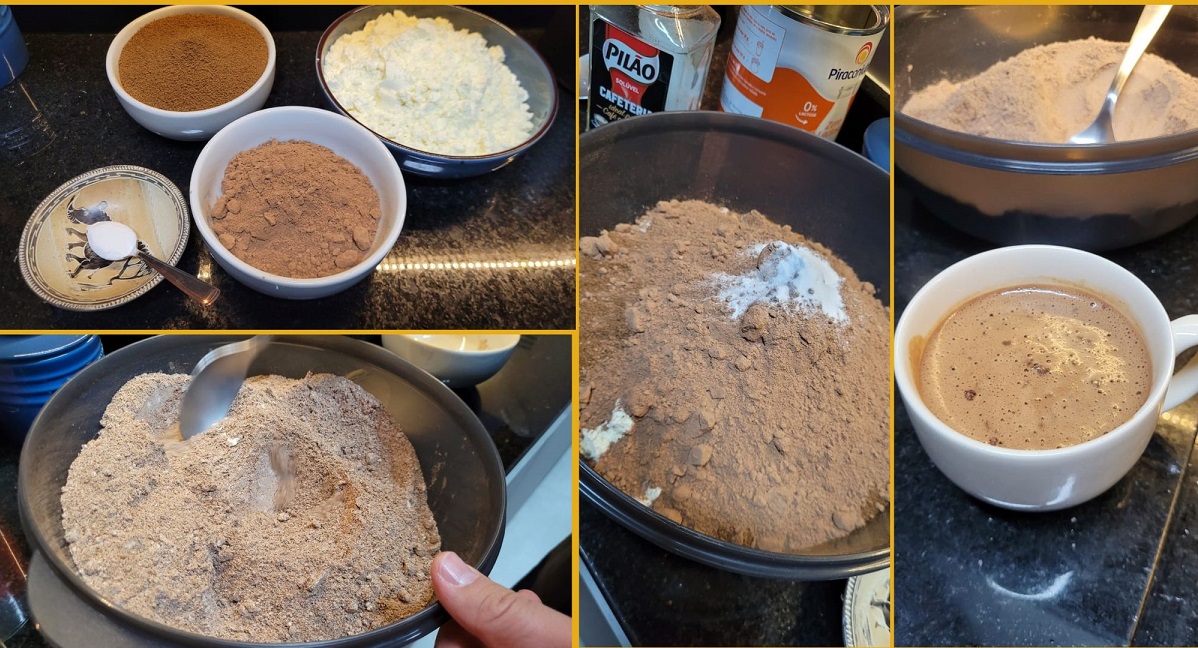 Cabe destacar o seguinte: sempre opte por chocolate em pó 32% de cacau (ou cacau 50, 70, até 100%) ao achocolatado, que atualmente é muito artificial e excessivamente doce. Caso prefira ou seja o que tem à mão, não coloque o açúcar pedido na receita; opte por adoçar na hora de servir, da maneira que escolher, com açúcar ou adoçante.