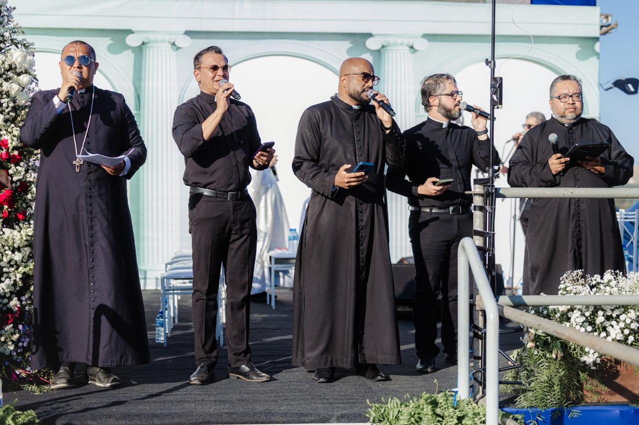 Com vozes que evangelizam, os padres cantores — padre Alexandre Lima, padre Denis-Ricard, padre Diogo Albuquerque, padre Antônio Medrado e padre Francisco Augusto — emocionaram os fiéis durante a Santa Missa