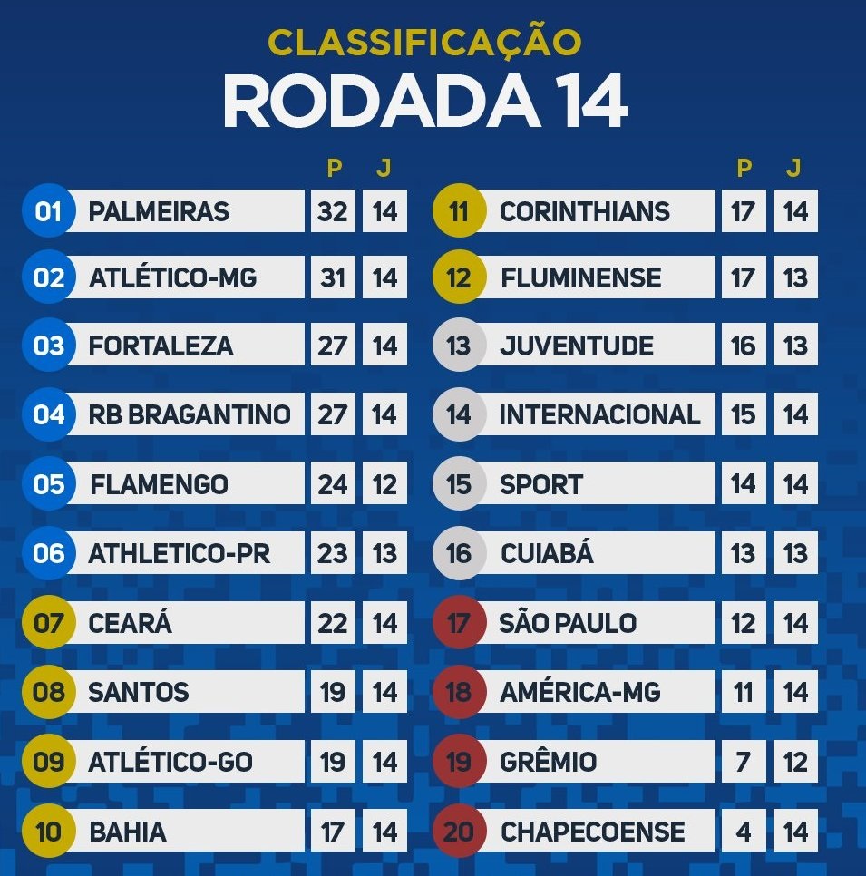 Obs.: não estão computados na Tabela de Classificação da Rodada 14 os pontos do jogo Sport x Red Bull Bragantino realizado na noite dessa sexta-feira.