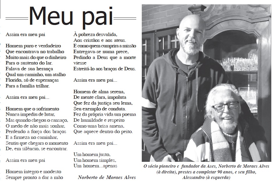O primeiro deles é de autoria de Norberto de Moraes Alves, o “poeta maior” da entidade, sócio pioneiro, fundador e ex-presidente da Ases a seu pai, Júlio de Moraes Alves. Acompanhe: