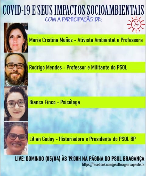 Neste domingo, 5, a partir das 19h, você não pode perder o encontro que vai rolar na página do Facebook do PSOL Bragança! O objetivo do bate-papo é levar informações superimportantes para a população sobre a pandemia do novo coronavírus (Covid-19) e seus impactos socioambientais.