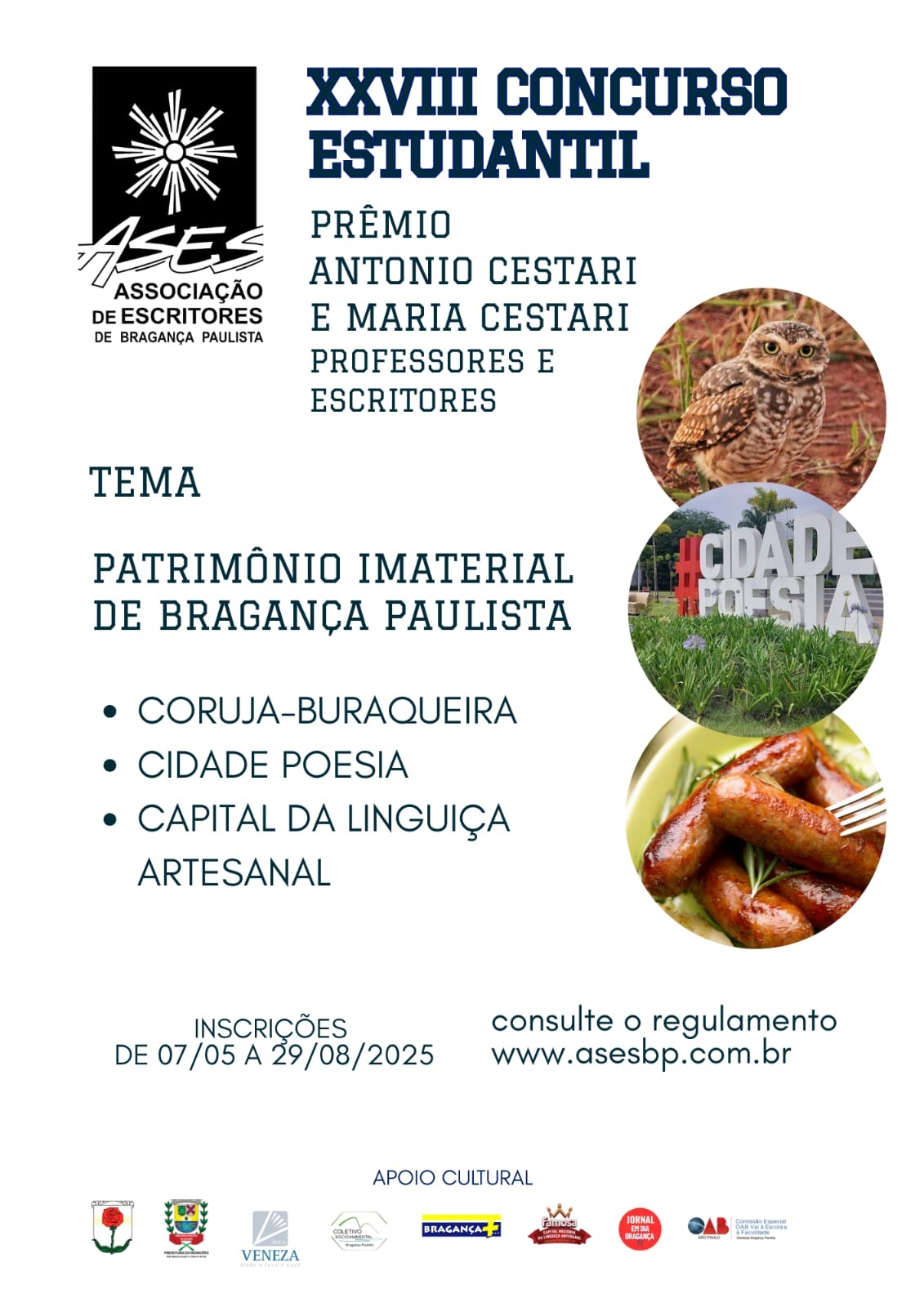 Seguem abertas as inscrições para o XXVIII Concurso Estudantil – Prêmio Antônio Cestari e Maria Cestari, realizado pela Ases (Associação dos Escritores de Bragança Paulista). O tema desta edição é o patrimônio histórico imaterial da cidade: a ave-símbolo de Bragança – a coruja buraqueira – e os epítetos Cidade Poesia e Capital da Linguiça Artesanal.