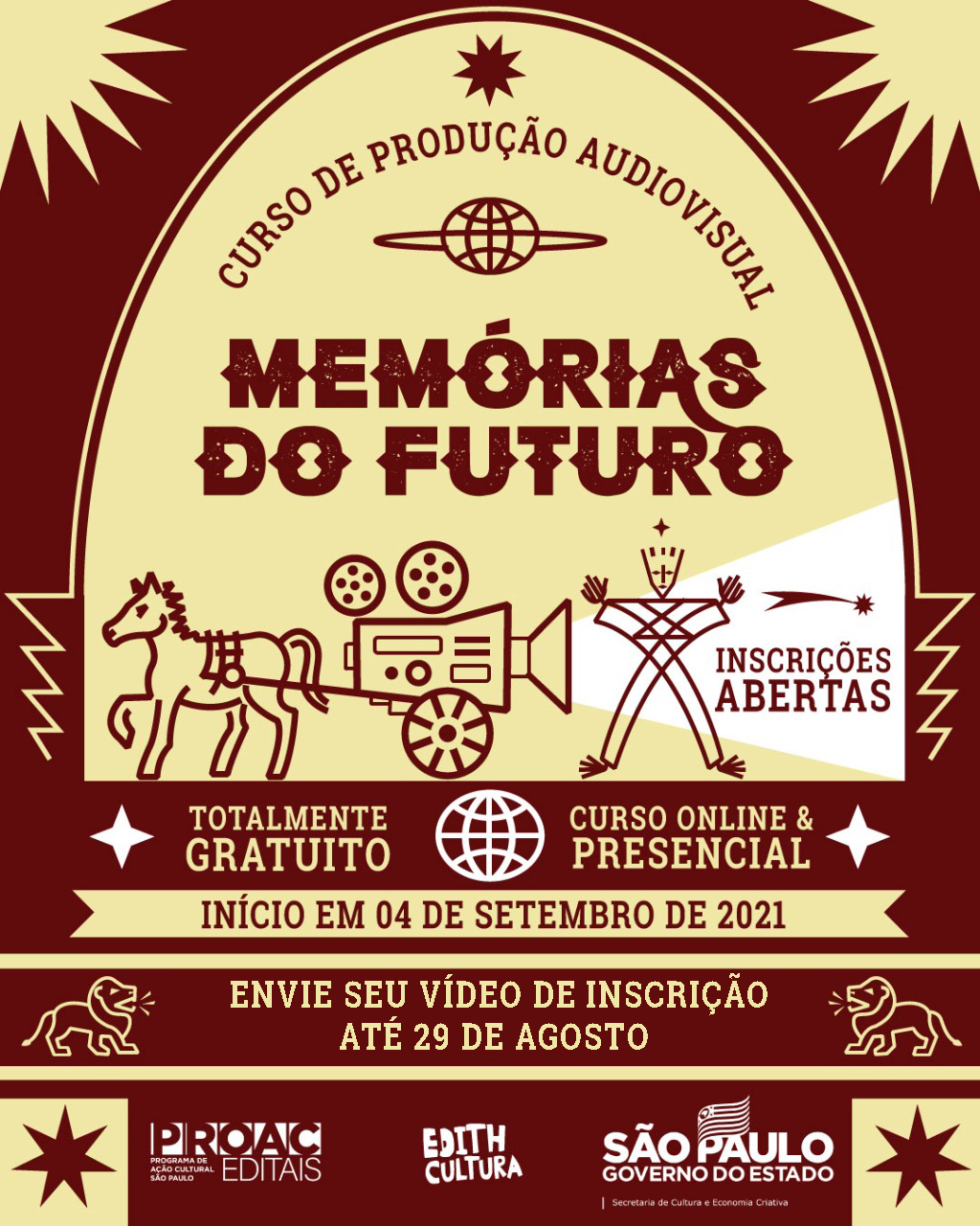 Até o dia 29 de agosto, estão abertas as inscrições para o curso de audiovisual “Memórias do Futuro”. Com realização do coletivo Edith Cultura e orientação do educador em tecnologias e artes Augusto Mojica, as aulas começam em 4 de setembro e irão até novembro, sempre aos sábados, das 15h às 18h.