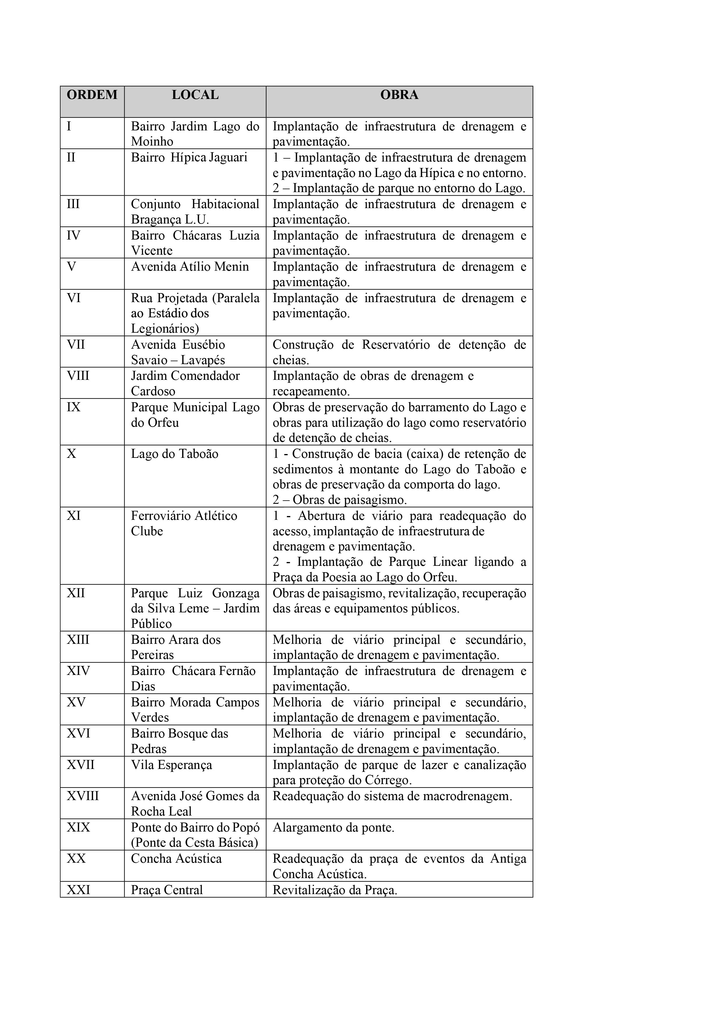 Será implantada, ainda, infraestrutura de drenagem e pavimentação em outras ruas, dos bairros Jardim Lago do Moinho, Hípica Jaguari, Chácaras Luzia Vicente e Conjunto Habitacional Bragança L.U, além da construção de um reservatório de detenção de cheias na Avenida Eusébio Savaio e obras de paisagismo, revitalização, recuperação das áreas e equipamentos públicos no Parque Luiz Gonzaga Leme (Jardim Público), entre outras melhorias.