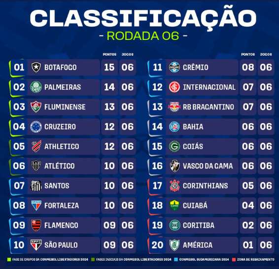 Ainda se recuperando de contusão, os seguintes jogadores estão no departamento médico: Leo Ortiz, Luan Cândido, Lucas Cunha, Nacho Laquintana e Raul (confira nesta página a classificação de momento do Brasileirão 2023).