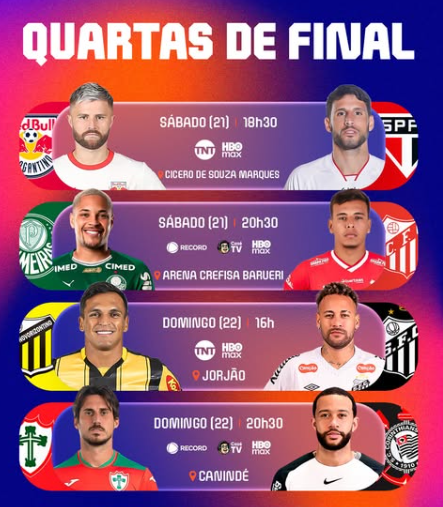 Nas quartas de final, o Red Bull Bragantino terá pela frente o São Paulo Futebol Clube, que terminou na sexta posição. O Braga, por ter a melhor campanha, disputará esta fase mata-mata em jogo único, como mandante. A Federação Paulista de Futebol definiu na tarde desta segunda-feira, que os duelos eliminatórios serão disputados no fim de semana. Confira: .
