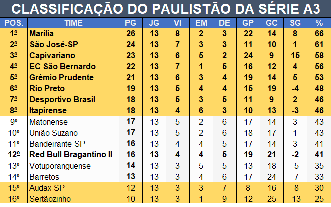 Para voltar a figurar entre os oito melhores times do Campeonato Paulista da Série A3, o Massa Bruta precisava da vitória, o que não aconteceu. Com isso, o time comandado pelo técnico Fábio Matias chega aos 16 pontos ganhos e continua de fora do G8, na 12ª posição.