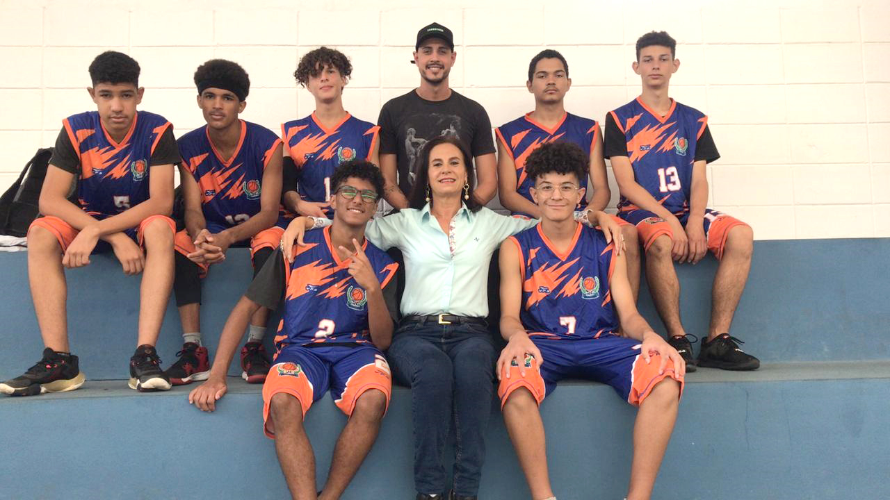 A dirigente regional Rosangela Valerio junto à equipe da PEI E.E. Júlio César Flórido Rafaeli, vice-campeã