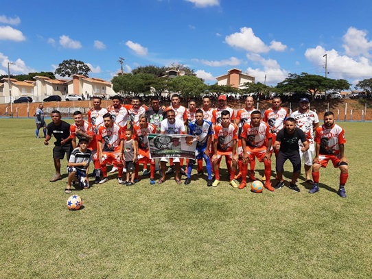 Time do Santa Lúcia, vice-campeão, e Édson com o banner em homenagem ao pai e ao irmão