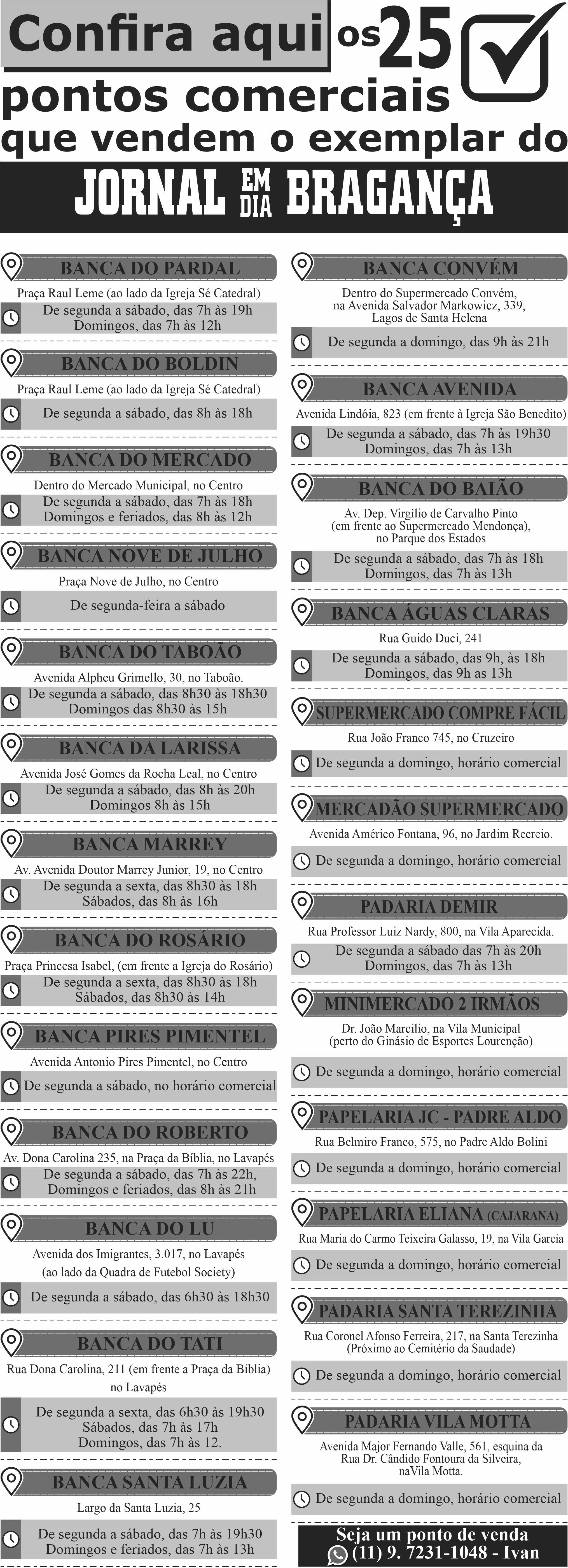 Nesta edição, você encontrará na página 9 os endereços e horários de funcionamento dos 25 pontos que comercializam o Jornal Em Dia Bragança. Essa lista te ajudará a encontrar o local mais conveniente para garantir o seu exemplar. Portanto, não perca tempo e mantenha-se bem informado sobre os acontecimentos locais e regionais!