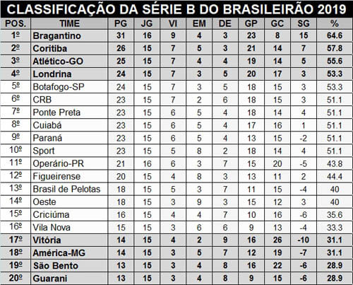 O Bragantino, que não vencia uma partida há três rodadas, continua firme na liderança isolada da Série B, agora com 31 pontos ganhos. O time do técnico Antônio Carlos Zago, com a vitória, abriu cinco pontos do segundo colocado, o Coritiba, que joga na noite desta terça-feira, 13, em casa, contra o Brasil de Pelotas, e sete pontos do quinto colocado que, neste momento, é o Botafogo, de Ribeirão Preto.