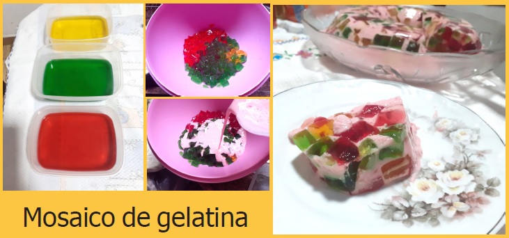 Foi quando vi pela primeira vez a foto dessa mistura de gelatinas desenformada em formato de bolo que recebia o nome de Mosaico de gelatina. Imediatamente copiei no meu caderno, sem testar.