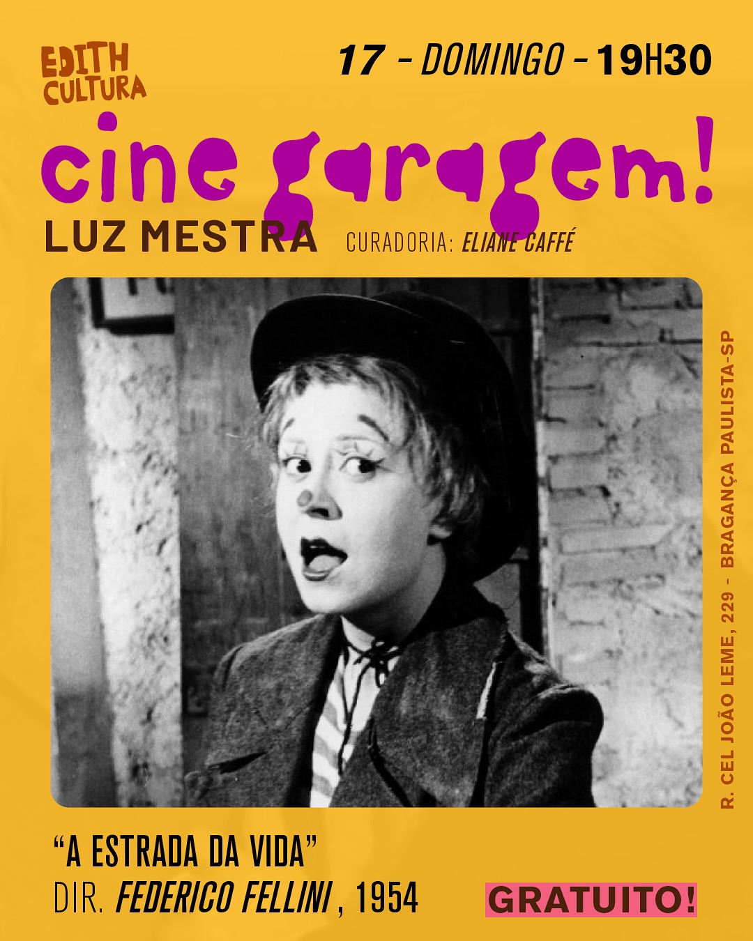 Neste domingo, 17, às 19h30, a programação da mostra “Luz Mestra” prossegue na Garaginha do Edith com a exibição do filme “A Estrada da Vida”, de Federico Fellini.