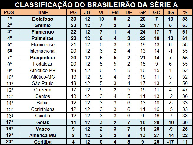 No momento, o Massa Bruta ocupa a sétima posição na tabela de classificação, com 20 pontos conquistados. A equipe está dois pontos abaixo do Palmeiras, que ocupa a quarta posição que garante uma vaga no G4, que leva o time para a disputa da Libertadores.