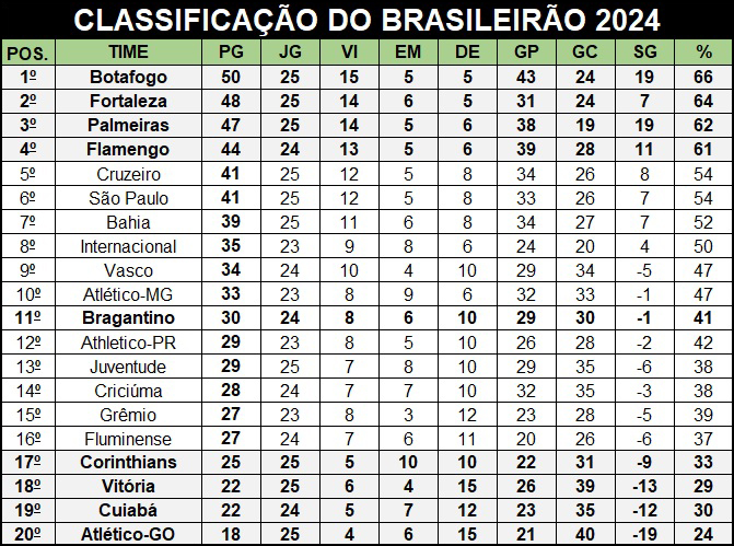 O Bragantino, que vem de vitória por 2 a 1 contra o Bahia pelo campeonato nacional, está com 30 pontos conquistados e ocupa a 11ª posição na tabela de classificação.