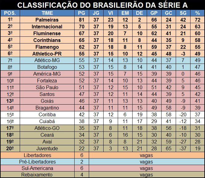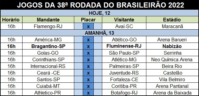 O Campeonato Brasileiro de 2022 chega ao final neste fim de semana com a disputa da 38ª rodada. Serão os últimos dez jogos da temporada, nos quais vão ser definidos os dois times que irão para a fase Pré-Libertadores e a última vaga para a Copa Sul-Americana. Os quatro times rebaixados estão praticamente definidos: Juventude, Avaí, Ceará e Atlético-GO.